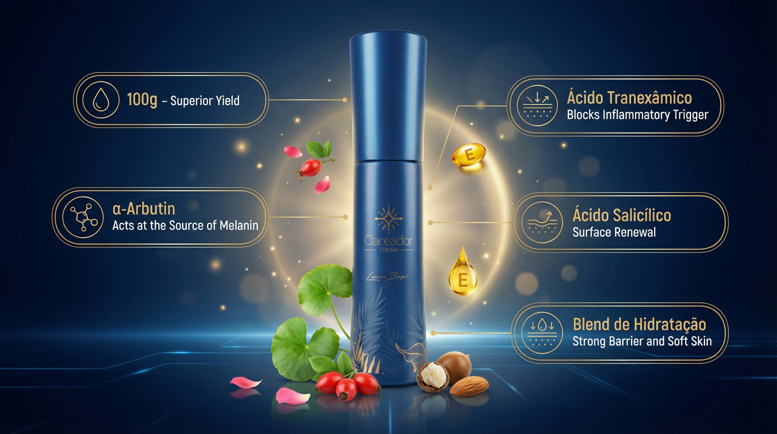 Ácido Tranexâmico reduz o gatilho inflamatório da mancha, acalma a pele e ajuda a uniformizar o tom com uso contínuo, sem agredir dia a dia.
